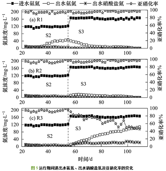 實(shí)驗(yàn)分為S1、S2、S3這3個(gè)階段:S1階段為亞硝化階段, 采用低碳氮比的人工配水啟動(dòng)亞硝化; S2階段為亞硝化污泥顆?;A段, 通過在R2、R3反應(yīng)器中分別添加20%的好氧顆粒污泥、20%除磷顆粒污泥以期加快顆粒化進(jìn)程; S3階段為強(qiáng)化顆?;A段, 通過增加進(jìn)水中的COD負(fù)荷和氨氮負(fù)荷, 促使亞硝化顆粒增大和提高系統(tǒng)的亞硝化性能.