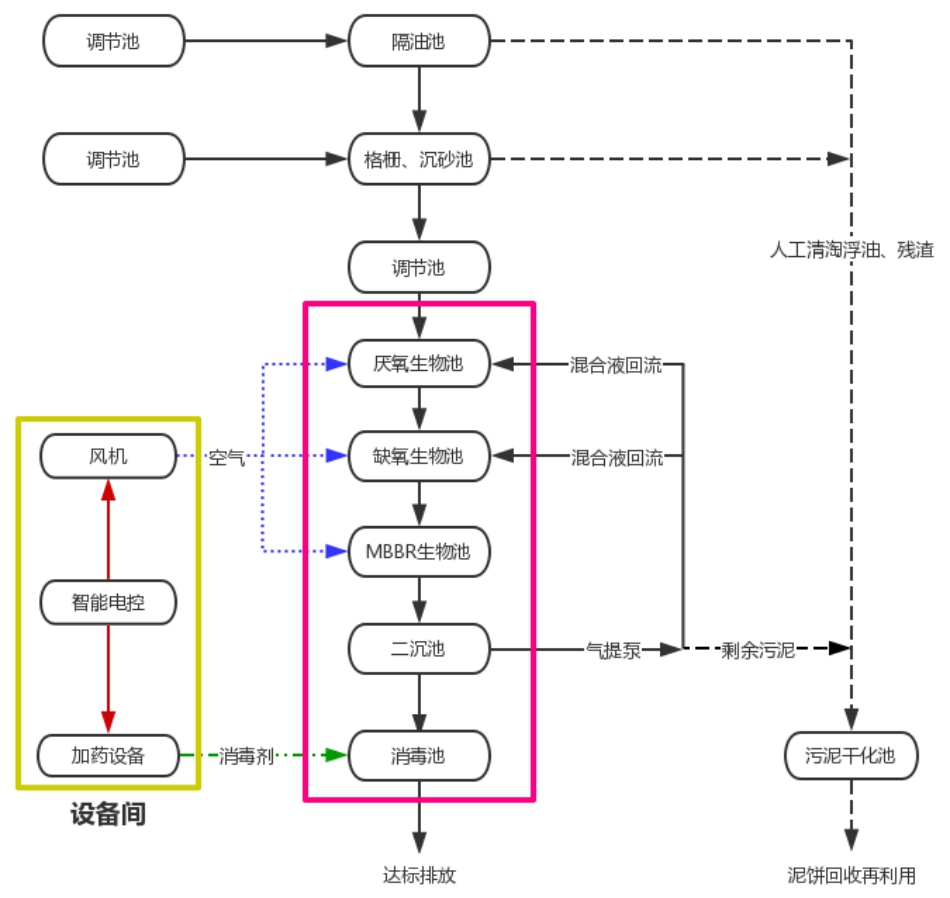 1 隔油池:廚房含油廢水排入隔油池,對污水進(jìn)行隔油預(yù)處理,有助于后續(xù)處理工藝的正常運(yùn)行;